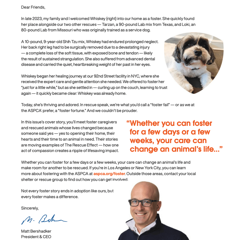 In developing the CEO’s welcome letter for the ASPCA's bi-annual membership magazine, I introduced a creative pivot by shaping it into a more personal, story-driven message rather than a traditional formal note to supporters and donors.